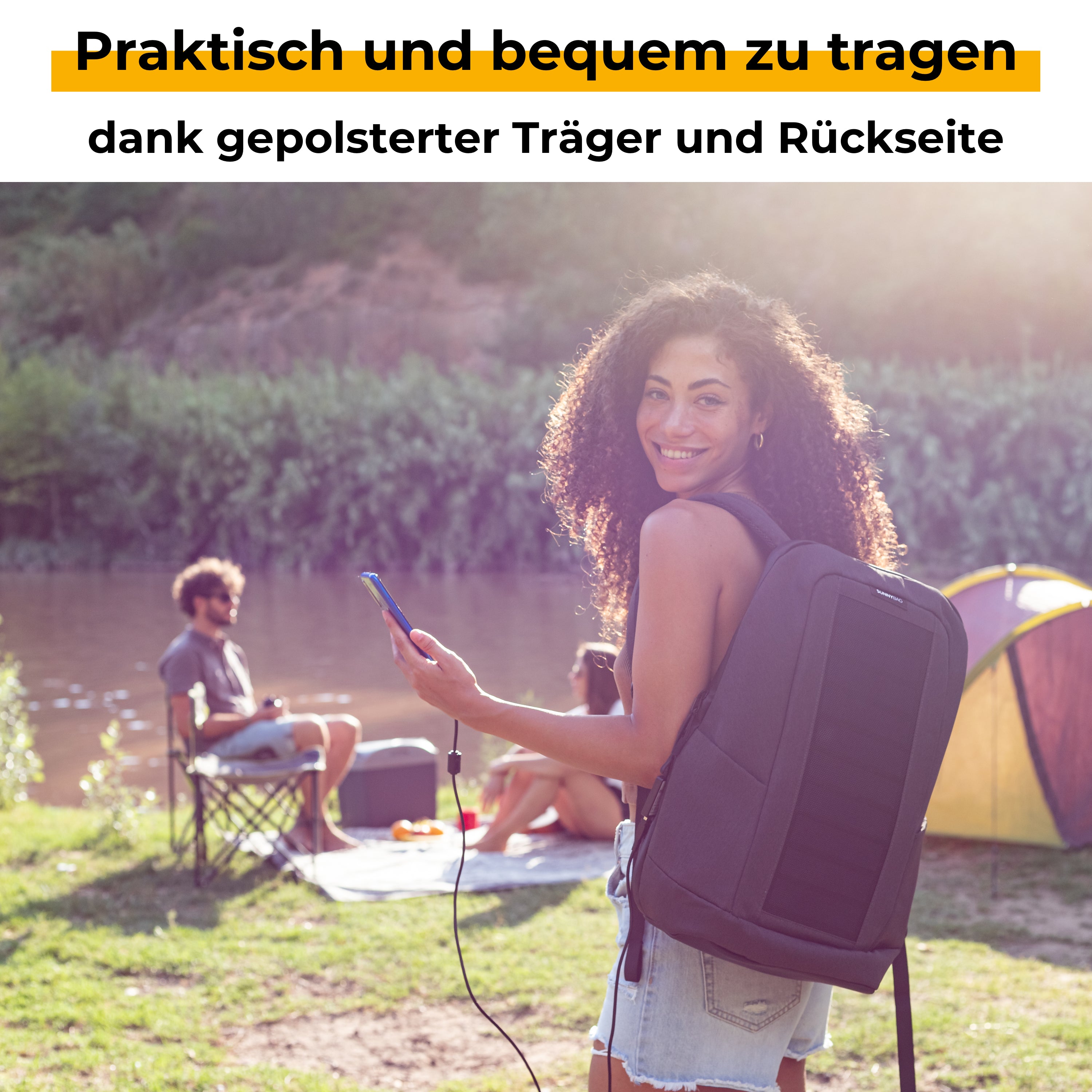Die Powerbank speichert die schwankende Solarenergie effizient ab und gibt sie gleichmäßig an dein Smartphone ab. So nutzt du dein SUNNYBAG am effizientesten.